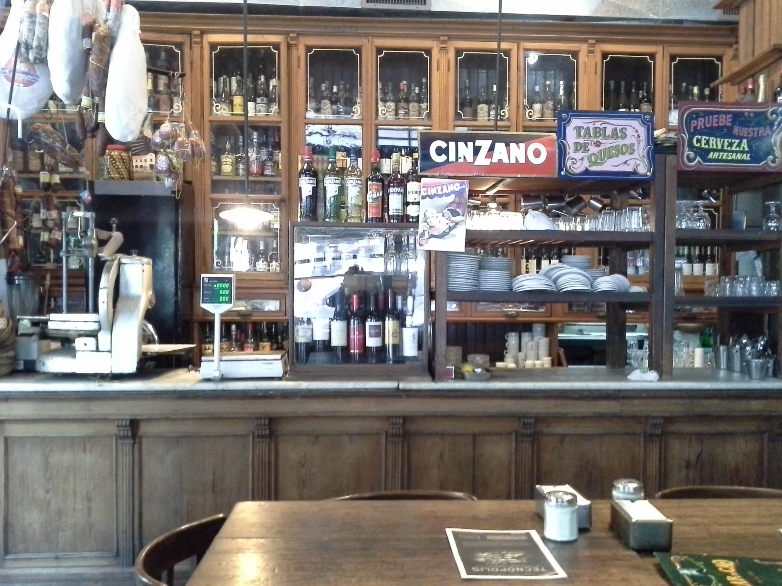 No voy extenderme en este post sobre la historia del lugar. Existe suficiente información y dejo unos cuantos links para los interesados. Sí quiero detenerme (excelente término para la ocasión) en la sensación que se experimenta al sentarse en una mesa del Bar de Cao. El Café ofrece una variedad de elementos auténticos que sirven de abrigo al alma. Es como volver a la antigua casa familiar de cada uno. Me recuerda al genial recurso narrativo de Woody Allen cuando irrumpía en el medio de una reunión familiar en casa de sus padres y observaba (y se observaba a sí mismo siendo aún niño) muchos años después y desde otra dimensión. El Bar de Cao provoca lo mismo. Las puertas vaivén, las ventanas guillotina, la madera que gana todo el espacio, las estanterías originales, la mesada de mármol, el piso original, todo produce la sensación de ver a los Hermanos Cao pesando y despachando mercadería o sirviendo aguardientes en el bar contiguo.