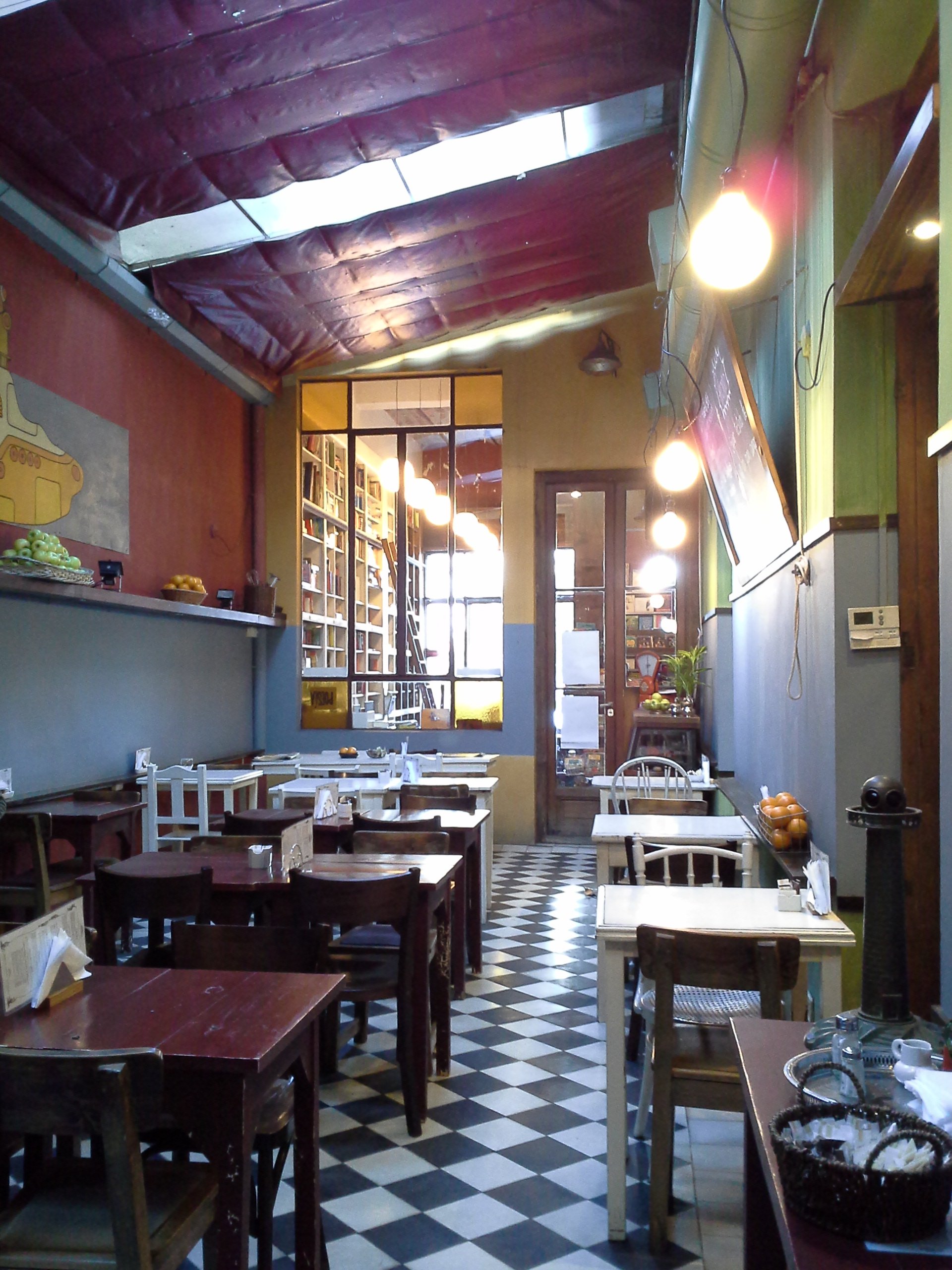 Libros del Pasaje queda en la calle Thames al 1762. El pasaje que referencia el nombre es Russel (entre Costa Rica y El Salvador). El café ocupa el espacio que debió ser el patio descubierto de una típica casa chorizo. Pero, además, las mesas ganan espacio en el interior de la librería lo que permite degustar un café sentado entre estantes de libros que brindan la sensación de estar en la cafetería de la biblioteca de babel borgeana. Piso, mobiliario y carpinterías remiten al más puro patrimonio urbanístico barrial de Buenos Aires.